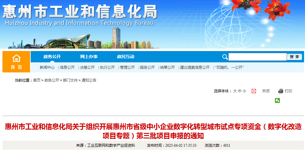 为加快推进我市省级中小企业数字化转型城市试点建设工作,根据《广东省工业和信息化厅 广东省财政厅关于做好省级中小企业数字化转型城市试点专项资金管理工作的通知》(粤工信工业互联网函〔2024〕57号)《惠州市工业和信息化局 惠州市财政局关于印发〈惠州市省级中小企业数字化转型城市试点专项资金奖补工作方案〉的通知》(惠市工信函〔2024〕58号)《关于印发〈惠州市数字产业基地高质量发展若干政策〉的通知》(惠市工信〔2024〕240号)有关要求,现组织开展惠州市省级中小企业数字化转型城市试点专项资金(数字化改造项目专题)第三批项目(以下简称“第三批项目”)申报工作,有关事项通知如下: