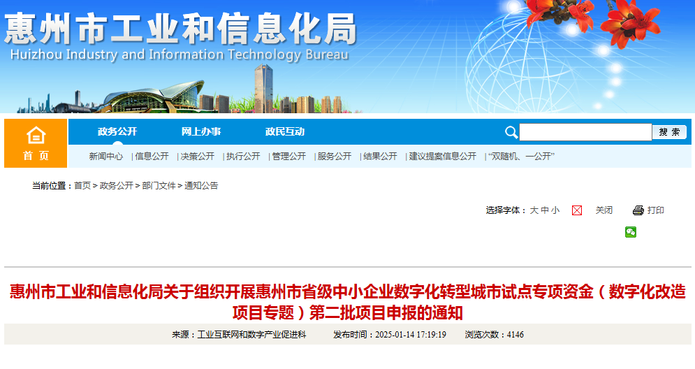 为加快推进我市省级中小企业数字化转型城市试点建设工作,根据《广东省工业和信息化厅 广东省财政厅关于做好省级中小企业数字化转型城市试点专项资金管理工作的通知》(粤工信工业互联网函〔2024〕57号)《惠州市工业和信息化局 惠州市财政局关于印发〈惠州市省级中小企业数字化转型城市试点专项资金奖补工作方案〉的通知》(惠市工信函〔2024〕58号)《关于印发〈惠州市数字产业基地高质量发展若干政策〉的通知》(惠市工信〔2024〕240号)有关要求,现组织开展惠州市省级中小企业数字化转型城市试点专项资金(数字化改造项目专题)第二批项目(以下简称“第二批项目”)申报工作,有关事项通知如下: