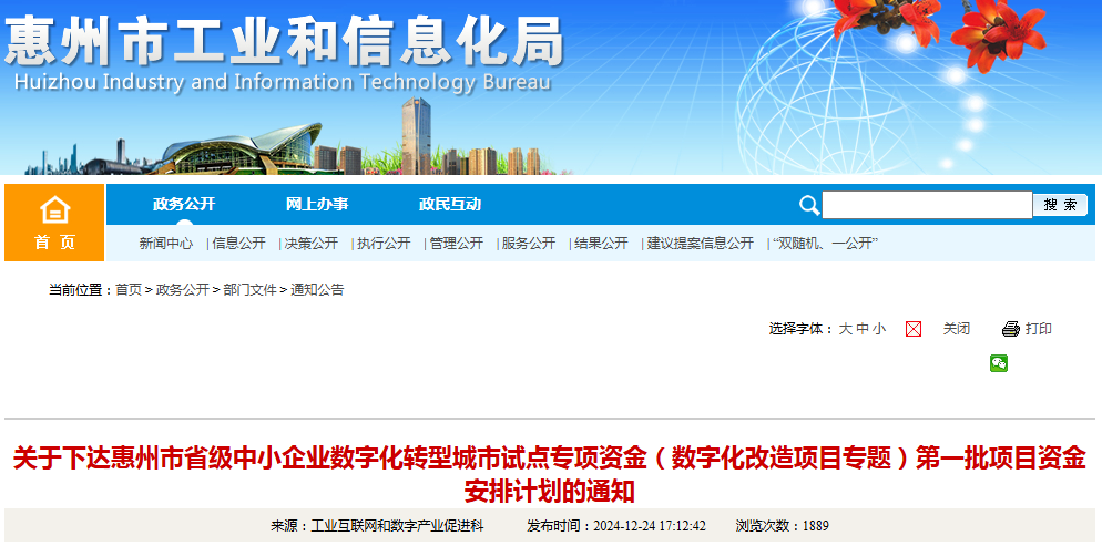 根据《广东省工业和信息化厅 广东省财政厅关于做好省级中小企业数字化转型城市试点专项资金管理工作的通知》(粤工信工业互联网函〔2024〕57号)《惠州市省级中小企业数字化转型城市试点专项资金奖补工作方案》(惠市工信函〔2024〕58号)《关于组织开展惠州市省级中小企业数字化转型城市试点专项资金(数字化改造项目专题)第一批项目申报的通知》(惠市工信函〔2024〕59号)等文件要求,经企业自愿申报、县(区)推荐、项目评审、信用核查、项目入库、局党组会议审议、网上公示和分管市领导专项资金分配方案审核专题会议审议等流程,并报市政府审批同意,安排惠州市省级中小企业数字化转型城市试点专项资金(数字化改造项目专题)第一批项目资金359.07万元。现将资金安排计划和绩效目标表下达你们,请按要求尽快联系同级财政部门将专项资金拨付至项目承担单位。有关资金由市财政局另文下达。