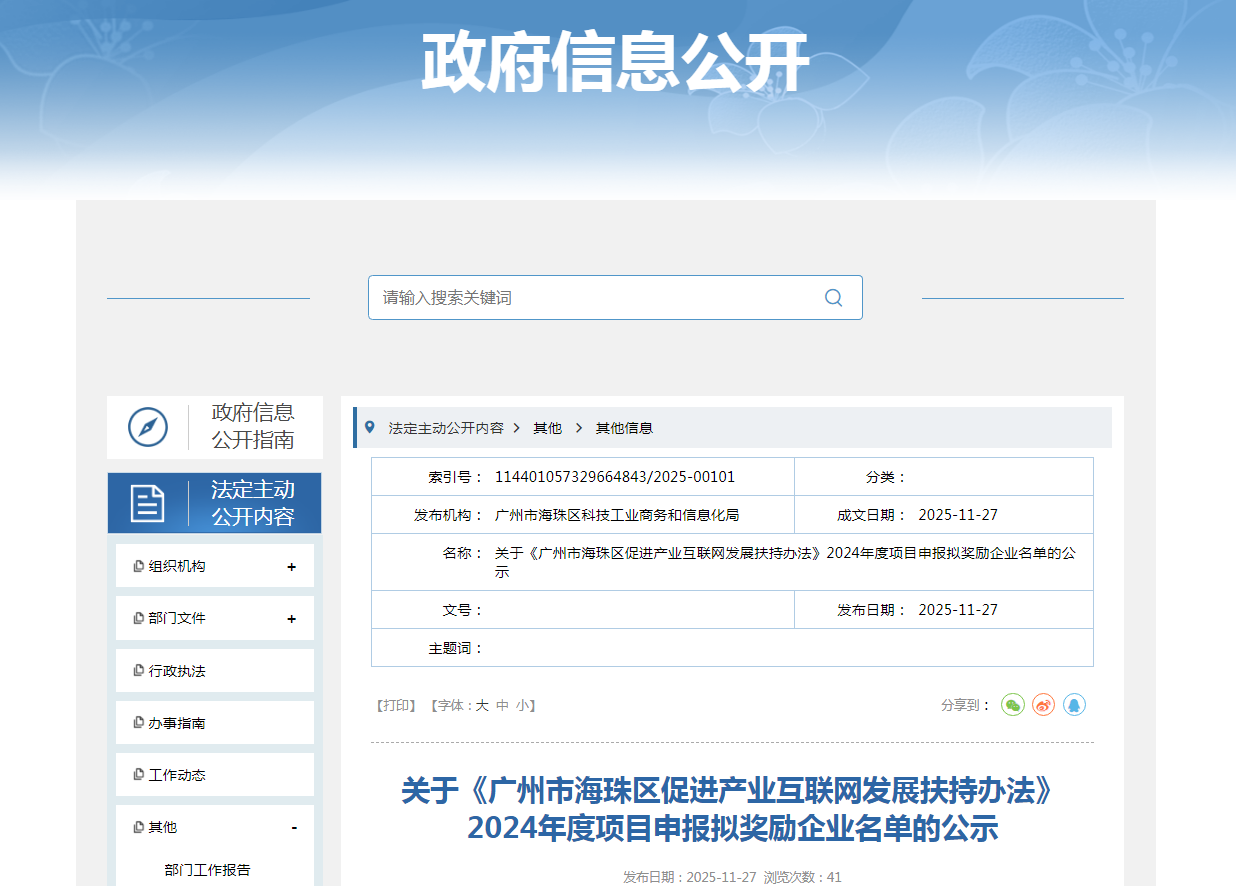 湾企服政策指引:根据广州市海珠区促进产业互联网发展相关扶持政策要求,我局牵头对2024年度项目申报企业(项目)进行审核,现将其中符合奖励政策规定的企业(项目)进行公示,公示时间为2025年11月27日至2025年12月3日。