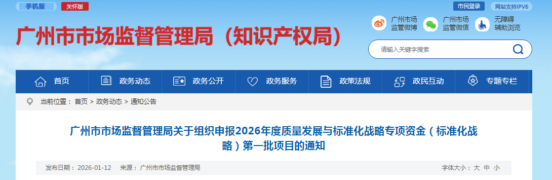 广州市市场监督管理局关于组织申报2026年度质量发展与标准化战略专项资金(标准化战略)第一批项目的通知